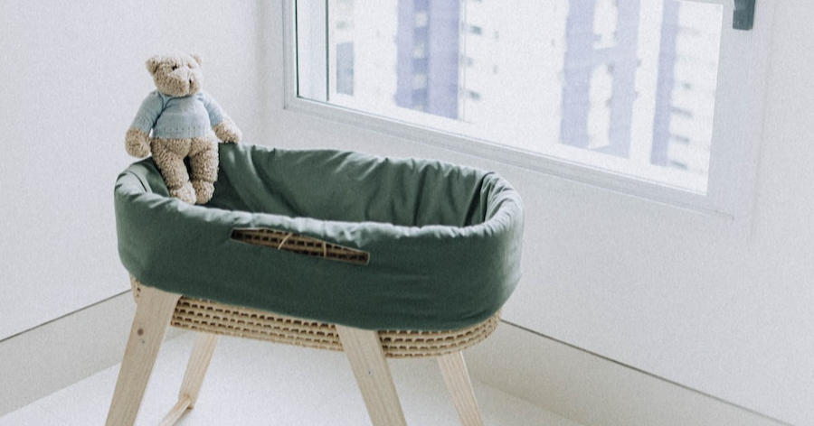 Shell-shaped bassinet with underwater motifs